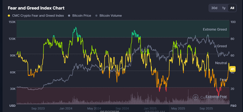 The crypto market also remained unchained, edging up just 0.45% to a $3.09 trillion market capitalization, according to CoinMarketCap data, while the CMC Fear and Greed Index shows a neutral appetite at 41.